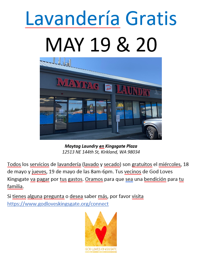 Is there anyone in the community you know that could benefit from a bit of help? On May 19 & 20, free laundry days have returned! Thanks to the generosity of Miguel and Jacqueline at Maytag Laundry and of Christians in the Kingsgate community, all laundry on Wednesday, May 19 and Thursday, May 20 at Maytag Laundry will be completely free. At the first iteration of free laundry days, the community set up a small food and clothing bank in the back of Maytag Laundry. Even if you don't need the free laundry, consider stopping by to care for the folks who are there and dropping off food or clothing in the food bank. If you have any questions, please send us a message.